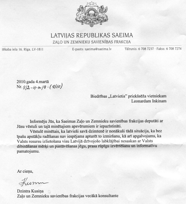 Saņemta vēstule no partijas «Zaļo un zemnieku savienība»